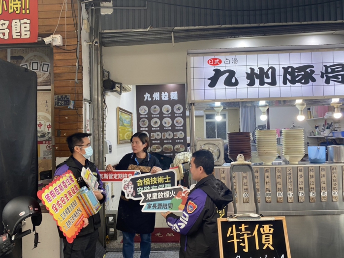 消防局說明,攤商煮食或更換瓦斯未安全操作致災案件時有所聞,年前消防局特別擇定逢甲、一中、廟東、東別等商圈,實地走訪攤商提醒瓦斯安全四大重點,首先,換裝液化石油氣容器應先關閉液化石油氣容器開關及周圍火源;第二,定期檢查維護設備,確認液化石油氣管線有無龜裂漏氣等情形。