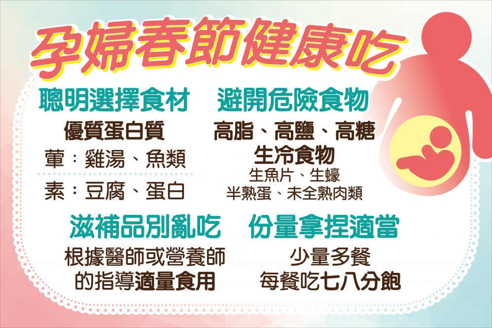 過春節總有美味佳餚讓人食指大動,但懷孕的準媽媽要怎麼吃,才能吃得健康?營養師許麗萍提示,「孕婦聰明選擇食材、避開危險食物、滋補品別亂吃,拿捏好份量,才能母子都健康」。