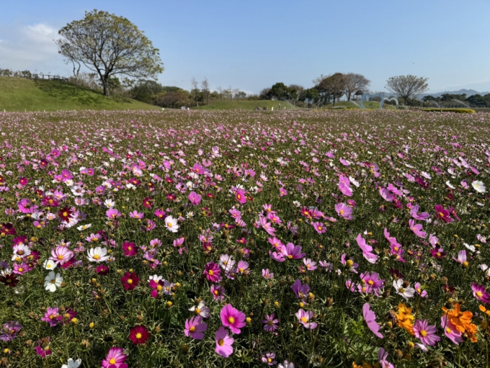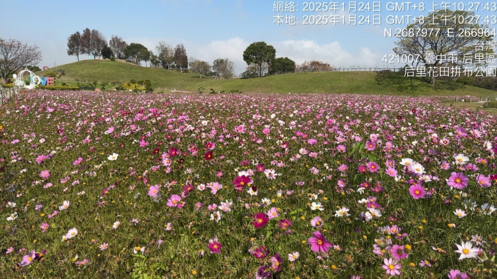 【記者陳榮昌后里報導】台中市長盧秀燕重視公園綠地的維護與品質,為提供市民春節期間優質的遊憩環境,建設局於后里環保公園精心打造1.5公頃的大波斯菊花海,分為三期種植,花海呈現白色、粉紅色、紫紅色等繽紛色彩,成為年節期間市民走春賞花的最佳選擇。建設局長陳大田27日表示,花海現正盛開,是春酒聚會及賞花的絕佳時機,並將持續綻放至元宵節,邀請市民前來感受繽紛花景與節慶氛圍。