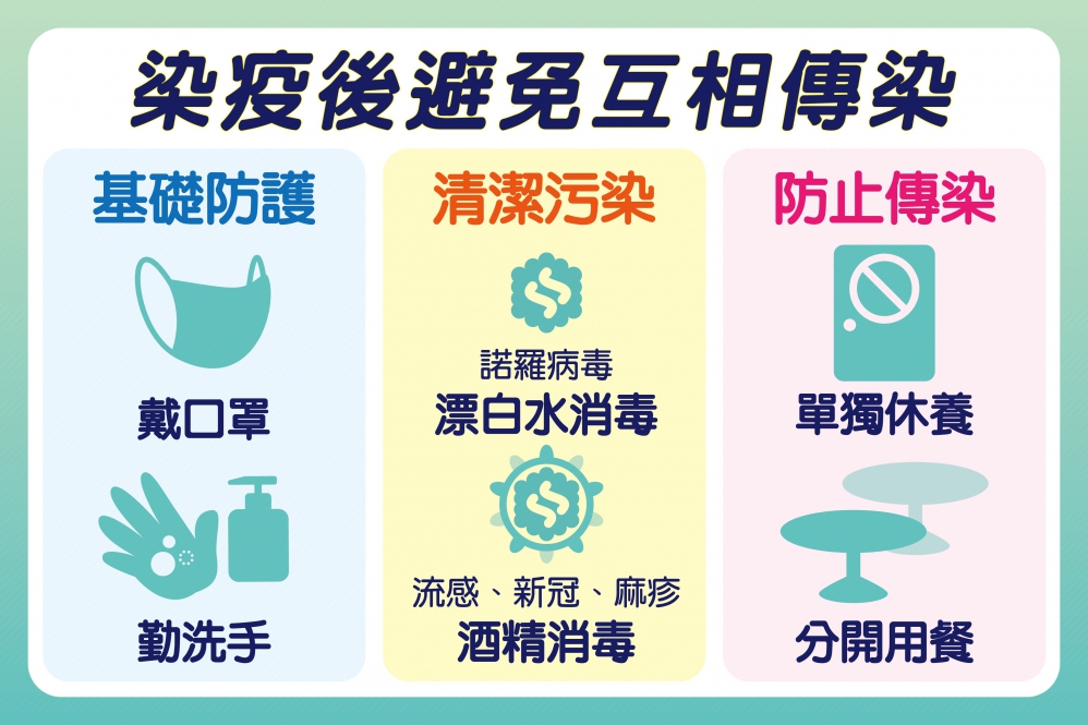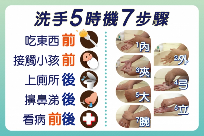如果家人感染,其他人要戴好口罩防止飛沫傳染,也要遵行洗手五時機,就是吃東西前、接觸小孩前、上廁所後、擤鼻涕後、看病前後,徹底按照內、外、夾、弓、大、立、腕七步驟洗淨,避免手碰觸口鼻眼感染。