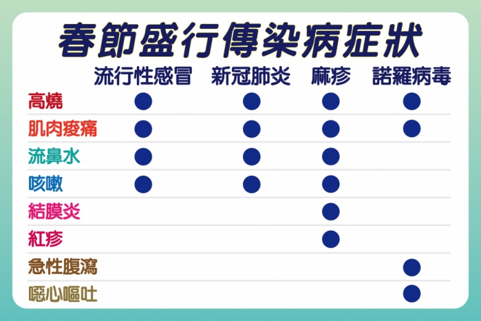 麻疹則會出現咳嗽、流鼻水與結膜炎(即所謂的3C:Cough、Coryza、Conjunctivitis);腸胃炎方面須注意諾羅病毒會經由飲食、排泄物傳播引起急性腹瀉、噁心嘔吐、肌肉痠痛及發燒。發生以上情形建議到傳染病特別門診就醫。