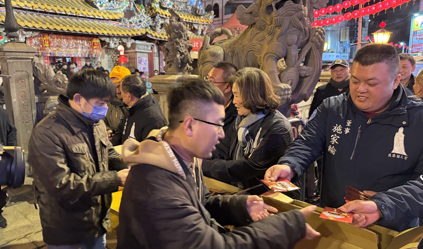 信眾拜拜插頭香後,於廟前排隊領取董監事們發放的媽祖福袋,廟方也特別呼籲去年獲得龍年福袋的信眾,記得在今年元宵節攜帶福袋參與兌獎,便有機會抽中價值不菲的「黃金媽祖」,讓媽祖的庇佑延續到新的一年。