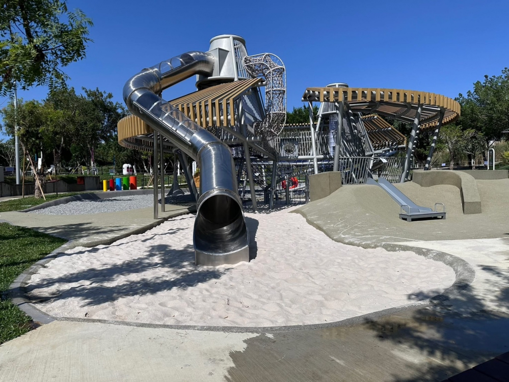 建設局長陳大田說明,台中城區首推西屯區「中央公園飛行美樂地遊戲場」,除了飛碟造型組合滑梯和全台最長32公尺滑索遊具外,還有日前最新完工開放的15米滑軌設施、多人360度離心與輪椅盪鞦韆等非典型遊具設施,都是小朋友到中央公園必玩的設施。