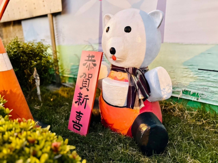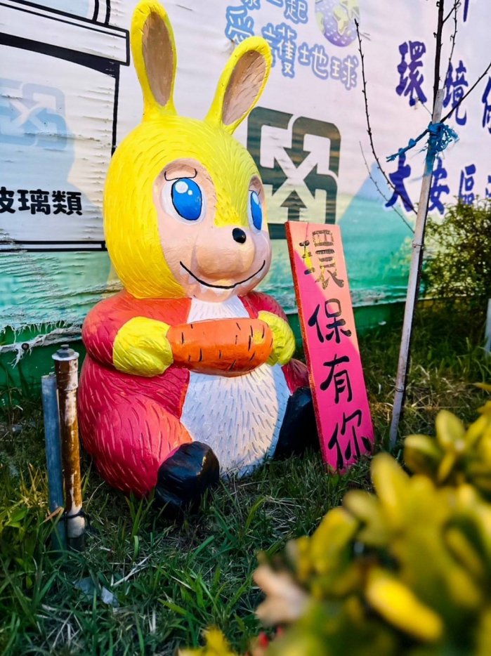 此外,去年年底,清潔隊也收到兩隻外觀恐怖的大型動物擺飾,一隻是流血流淚的大白熊、另一隻是兩眼無神的大兔子,但外觀型態完整,丟掉實屬可惜。經過隊員發揮巧思,展現藝術天份,結合正夯的卡通兔造型(拉布布)、大白熊穿新衣拜年,再將收回的廢棄窗框、廢木材加以組合彩繪成「金蛇迎春、恭賀新喜、環保有你」春聯,讓清潔隊部環境增添年節溫馨可愛氣氛,也讓舊物重獲新生,一舉數得。