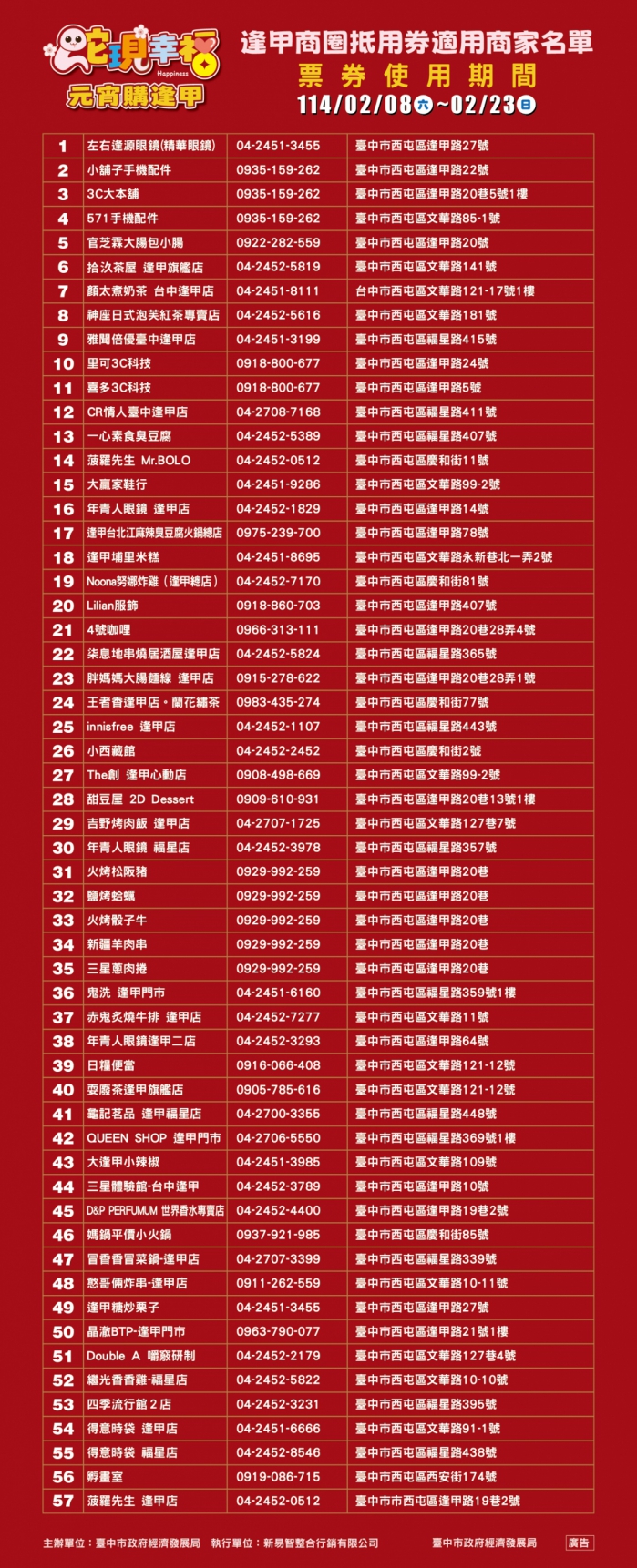 此次活動共有57家合作店家可以折抵消費,涵蓋各式知名異國美食、日常用品及文創小物,如官芝霖大腸包小腸、一心素食臭豆腐、Noona努娜炸雞、innisfree、小西藏館、The創、赤鬼炙燒牛排、QUEEN SHOP服飾及繼光香香雞等,券樣須於2月23日前使用完畢。