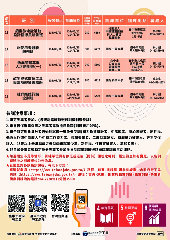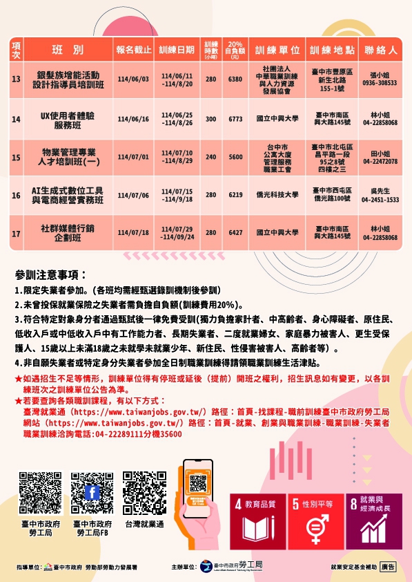 勞工局說明,一般失業勞工負擔受訓經費20%,曾投保過就業保險自願、非自願失業者或特定對象者通過甄試後一律免費受訓。特定對象於參加全日制訓練期間還能申請每月1萬7154元職業訓練生活津貼,歡迎待業民眾至台中市府勞工局網站(https://www.labor.taichung.gov.tw/)或台灣就業通網站(https://www.taiwanjobs.gov.tw/)查詢各項職訓班,或電洽勞工局就業安全科04-22289111分機35618、35619、35615詢問。