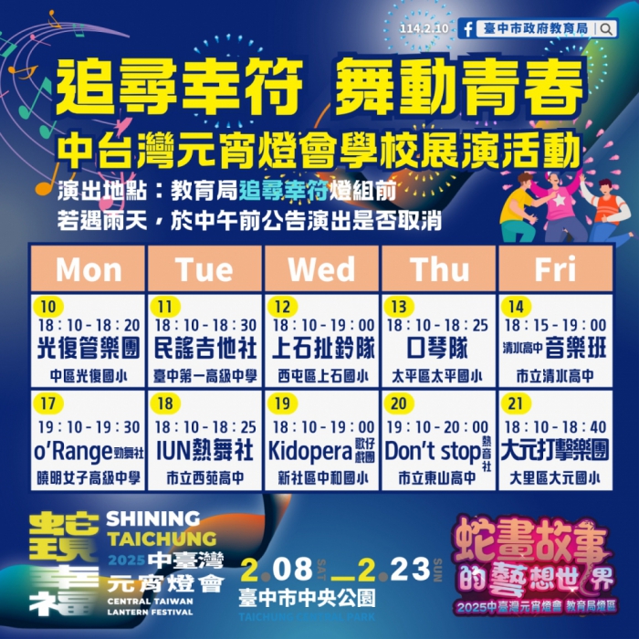 此外,平日晚間邀請台中一中、清水高中、曉明女中、西苑高中、東山高中、中區光復國小、大里區大元國小、西屯區上石國小、太平區太平國小、新社區中和國小等學校,於晚間6時至7時在「追尋幸符」燈組帶來精彩表演。