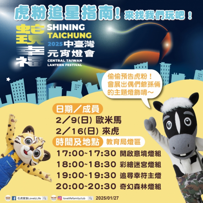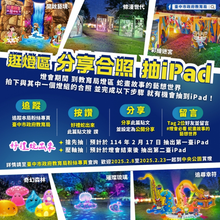 教育局表示,歡迎追蹤台中市政府教育局Facebook粉絲專頁,於燈會期間到「蛇畫故事」燈區拍照並留言分享,就有機會抽中平板,活動詳見:https://www.facebook.com/TaichungEducation。