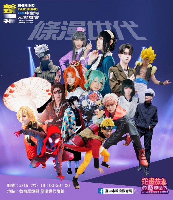 教育局長蔣偉民表示,為讓民眾擁有幸福的賞燈旅程,燈會期間假日安排多場精采表演,包括2月15日晚上7時,將有多位動漫Coser齊聚於「條漫世代」燈組與賞燈民眾見面;「歐米馬與來虎」則於2月16日晚上5時將到燈區與民眾一同賞燈;2月22日晚上8時,清新女聲動漫歌手Yaki將至「追尋幸符」燈組演唱動漫組曲。
