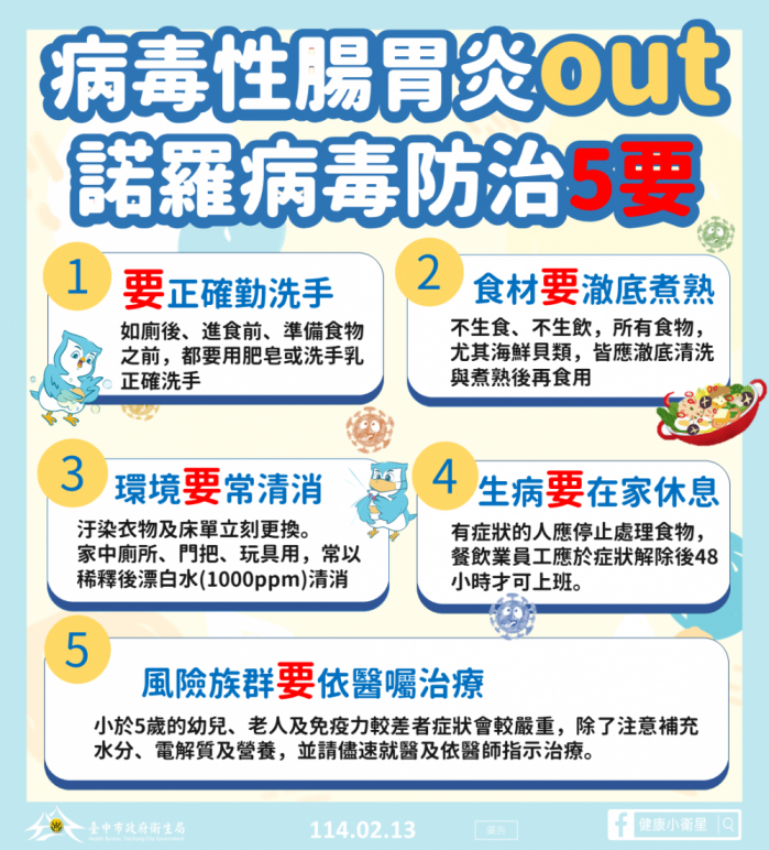 曾梓展提醒,落實正確洗手五步驟(濕、搓、沖、捧、擦)及搭配洗手好時機,包含接觸幼兒前、擤鼻涕後、看病前後、如廁後、進食和備餐前,以肥皂或洗手乳正確洗手;注意食物貯存或調理過程應符合衛生條件、避免生熟食交叉污染、食物徹底煮熟再食用(尤其是蚵、貝類等帶殼水產);居家環境,如廁所、門把、玩具等,常以稀釋後漂白水(1,000 ppm)清消;出現不適症狀儘速就醫,生病在家休息,不上課不上班。