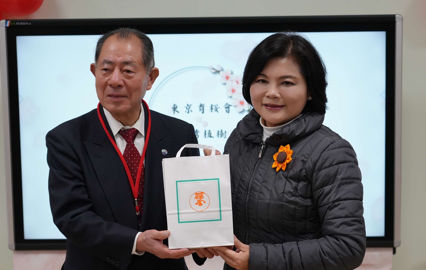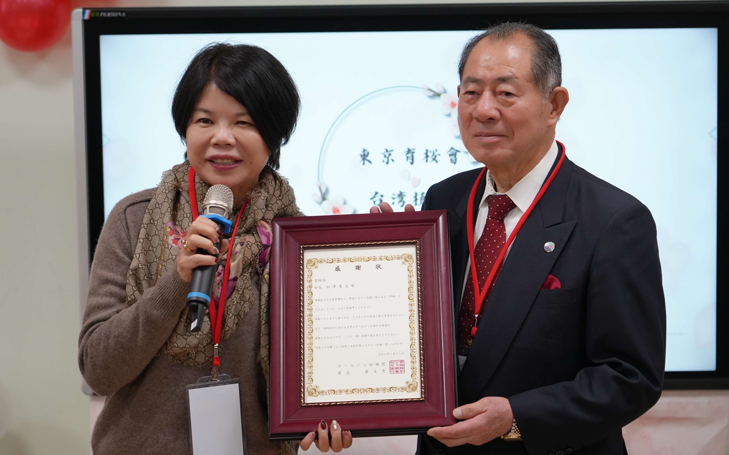 幼兒教育協會理事長廖文秀感謝日本育櫻會理事長松澤寬文及其會員一同於麥寮鄉幼兒園種下象徵友誼的櫻花樹。(圖/記者蘇榮泉攝)
