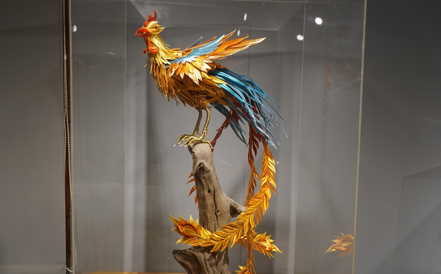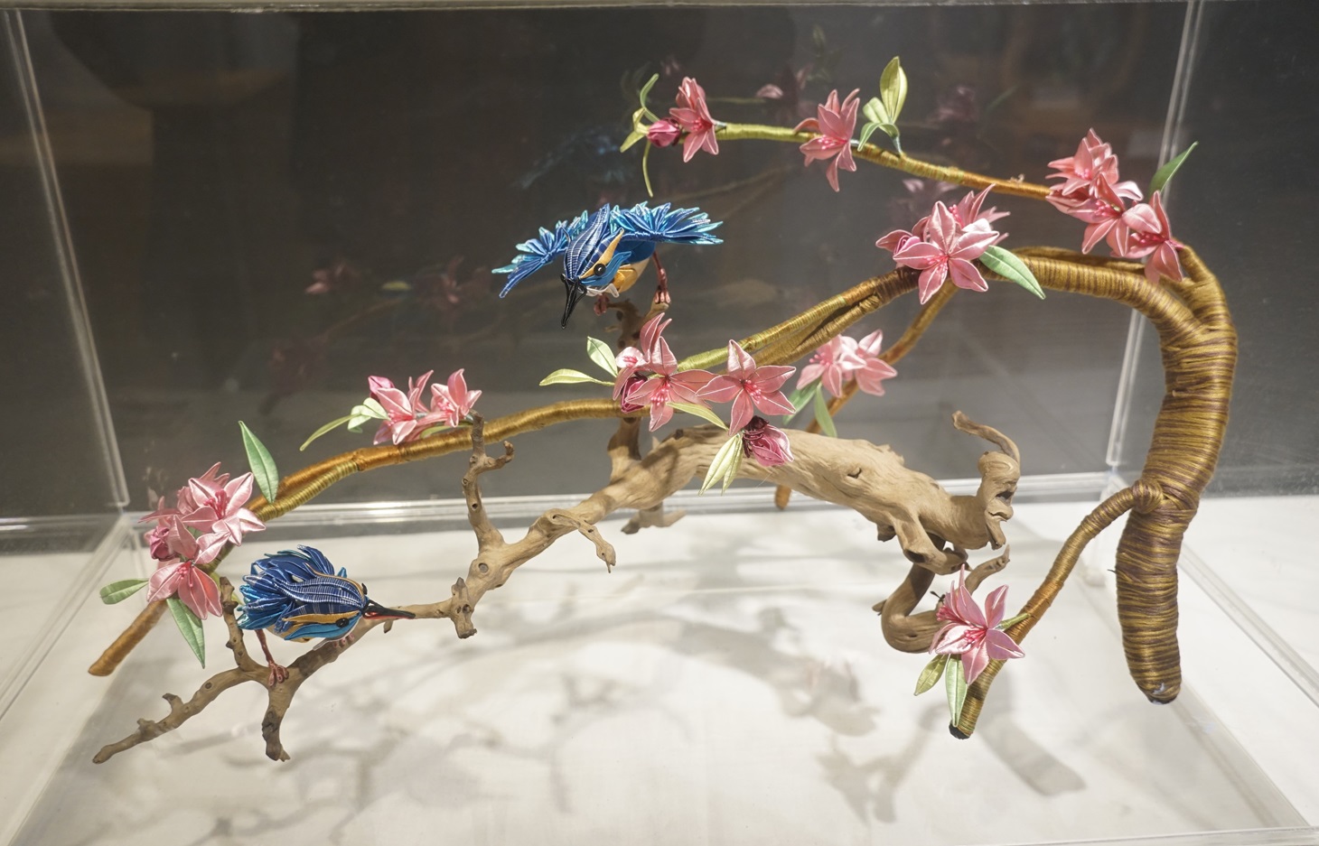 透過纏花技法巧妙呈現白孔雀、鳳凰、藍鵲等鳥類的姿態,展翅欲飛的作品栩栩如生,展現動靜之間的絕妙層次。(圖/記者蘇榮泉攝)