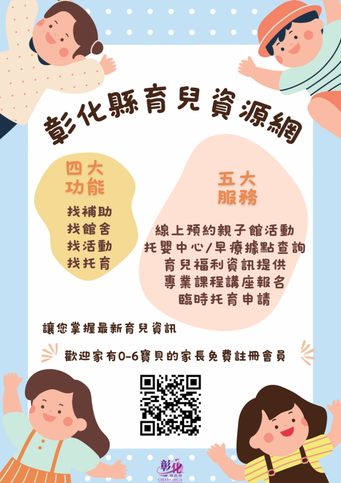 社會處表示,「彰化縣育兒資源網」已開放給0歲至6歲幼兒的家長免費註冊,詳情請連結網頁或洽詢親子館,育兒資源網址:https://dearbaby.chcg.gov.tw。
