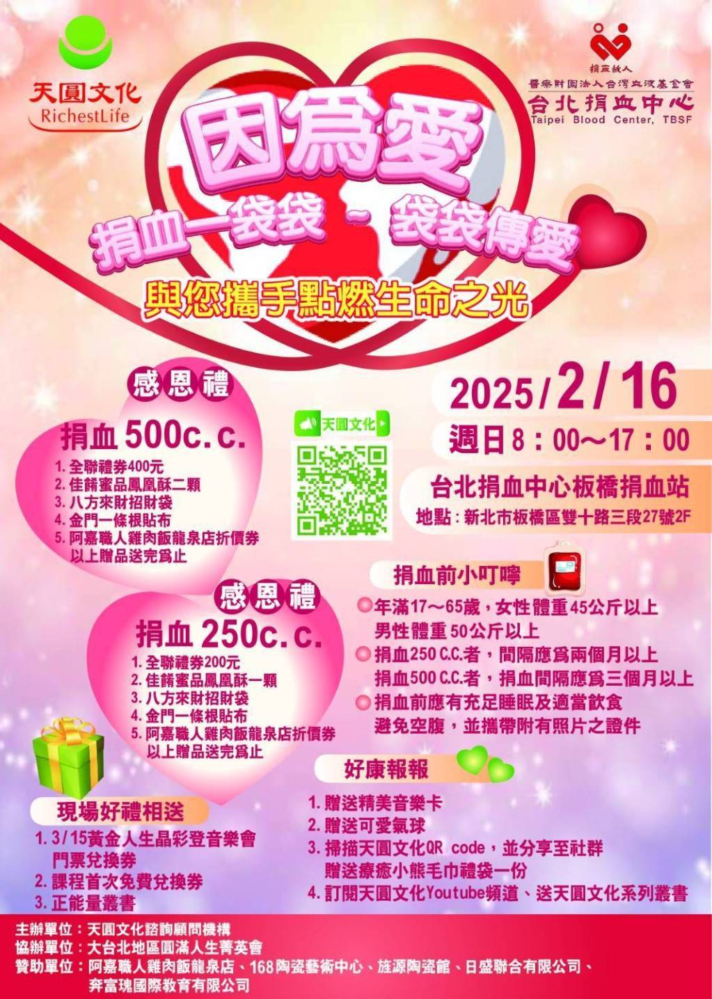 天圓文化諮詢顧問機構將於2025年2月16日(星期日) 08:00 ~17:00在新北市板橋區雙十路三段27號2樓攜手台北捐血中心板橋捐血站一起舉辦 「因為愛 捐血一袋袋 袋袋傳愛」活動;熱情邀請社會大眾挽袖捐熱血!鑑於近期各地血庫存量告急,天圓文化支持社會公益一向不遺餘力,在全台的北、中、南各地已舉辦多場捐血活動,截至目前為止已募得逾千袋熱血,成績亮眼!2/16公益捐血袋袋傳愛列車將再次出發,前進板橋捐血站!送愛盈血庫,點燃生命之光。