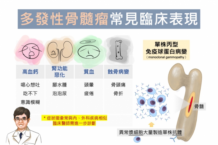 黃冠博指出,多發性骨髓瘤臨床症狀表現很多元,包含高血鈣、腎功能惡化、貧血和蝕骨病變,因為症狀徵象常與其他內、外科疾病相似,臨床醫師診斷其實並不容易,需要多種血液檢驗、影像醫學和骨髓檢查,來確定疾病範圍和嚴重程度。黃冠博提醒:若有類似骨髓瘤常見症狀,經評估治療遲遲未改善、或找不到原因甚至惡化,就要有所警覺,尋求進一步的檢查來診斷,才能對症下藥。