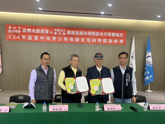 【記者林獻元台中報導】高爾夫運動在台中逐漸萌芽,為培育優秀高爾夫運動人才,在市府運動局的支持下,台中市體育總會高爾夫委員會於23日與豐原高爾夫俱樂部簽署合作意向,共同支持台中青少年高爾夫的培訓計劃。運動局長游志祥代表出席見證,感謝豐原高爾夫球場加入培育台中市高球菁英的行列,讓台中的高球菁英培育基地再加一,期望透過高爾夫委員會、台中高爾夫球場及運動局三方共同攜手合作,有效提升台中市高爾夫運動成績。