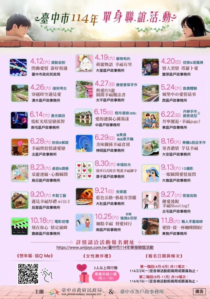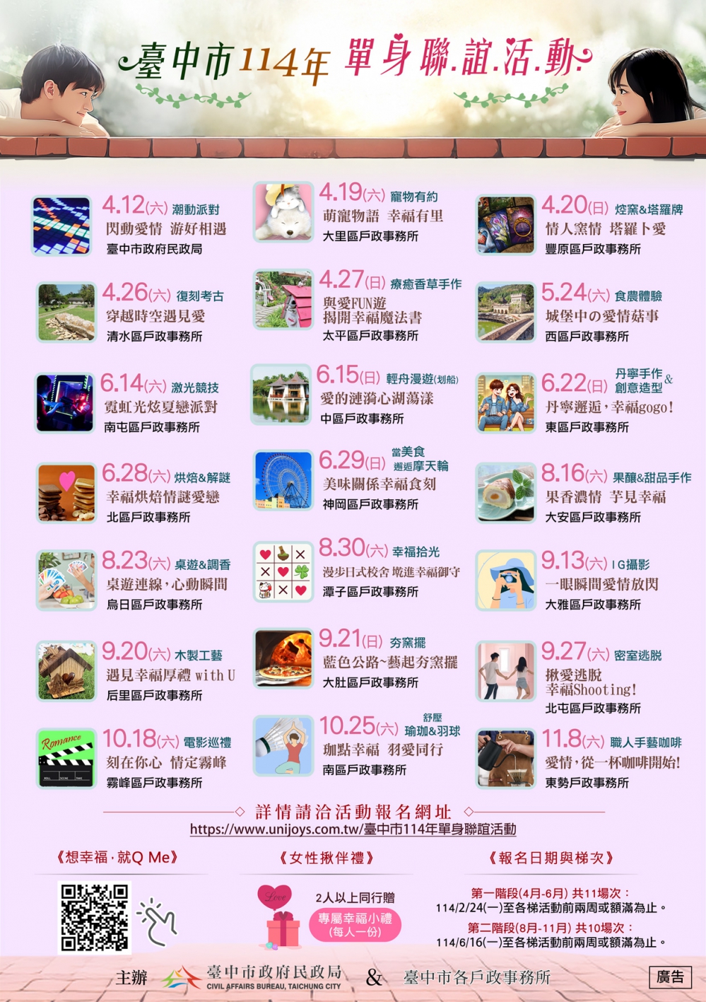 吳世瑋表示,台中市114年單身聯誼活動分二階段開放網路報名,第一階段共11場次,24日上午8時起開放報名;第二階段則有10場次,將於6月16日上午8時起開放,每人酌收報名費500元,每場次報名均至額滿為止;另女性揪伴一起報名成功,還可獲贈精美小禮,歡迎單身民眾選擇適合自己的年齡、興趣場次報名參加。