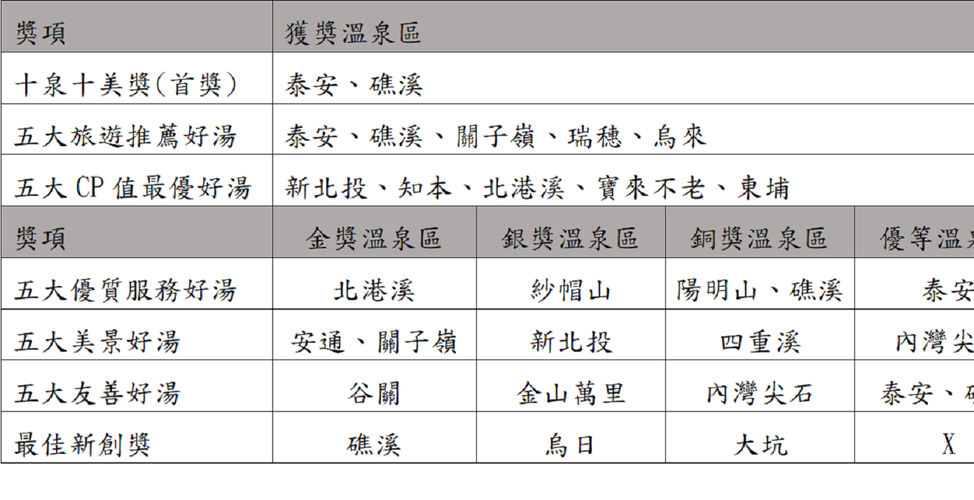 經過2個月的評審委員實地訪視及為期1個月的網路票選,19個溫泉區各個全力以赴,最終由「泰安溫泉區」及「礁溪溫泉區」奪得本屆首獎「十泉十美獎」!這個獎項不僅代表得獎溫泉區擁有高人氣與高聲量外,還要在環境美學、服務品質、周邊景點串連等多方面都有突出的表現,也透過良性競爭提升全臺灣溫泉區的品質。
