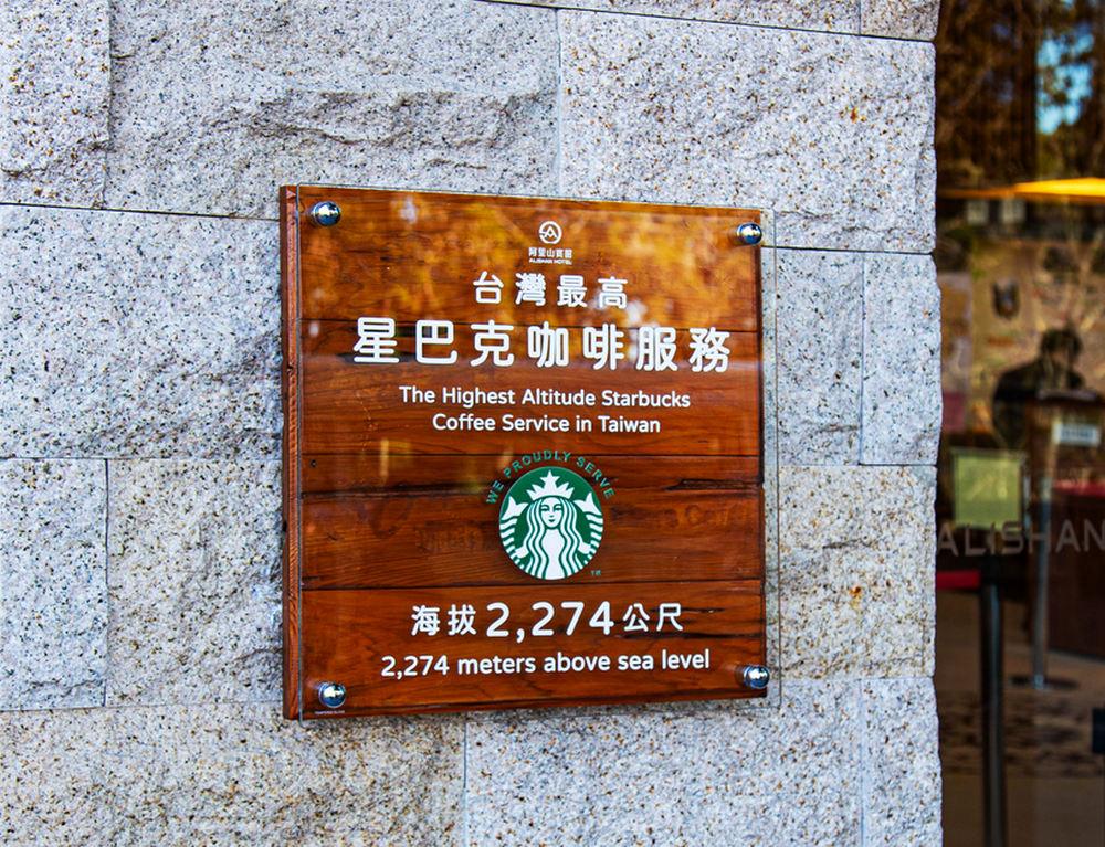 阿里山賓館星巴克咖啡位於海拔2,274公尺四周環繞著壯麗山景,