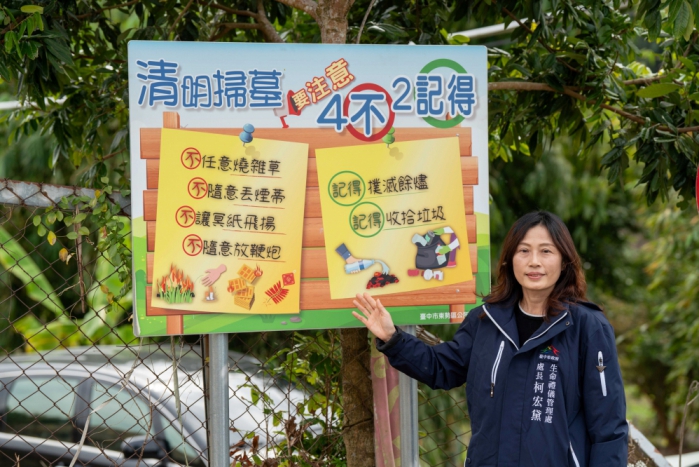柯宏黛提醒民眾掃墓時切記「四不二記得」要訣,不亂燒雜草、不亂丟煙蒂、不飛揚冥紙、不燃放爆竹,以及記得滅餘燼、記得收垃圾,讓祭祖掃墓更平安順利。