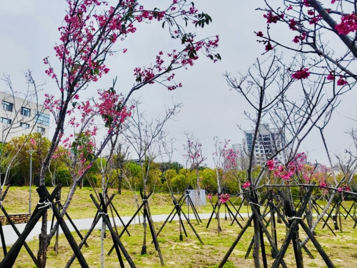 建設局長陳大田表示,市政公園原先種植的櫻花樹因長期受強烈日照與不適宜的土壤影響,導致樹勢衰弱。經專家評估後,市府決定將其移植至環境更適宜的嶺東公園。如今,這批櫻花在細心養護下已順利適應新環境,近日陸續綻放,粉嫩花蕊點綴園區,為公園增添春日浪漫氛圍,也讓市民多了一處賞花好去處。