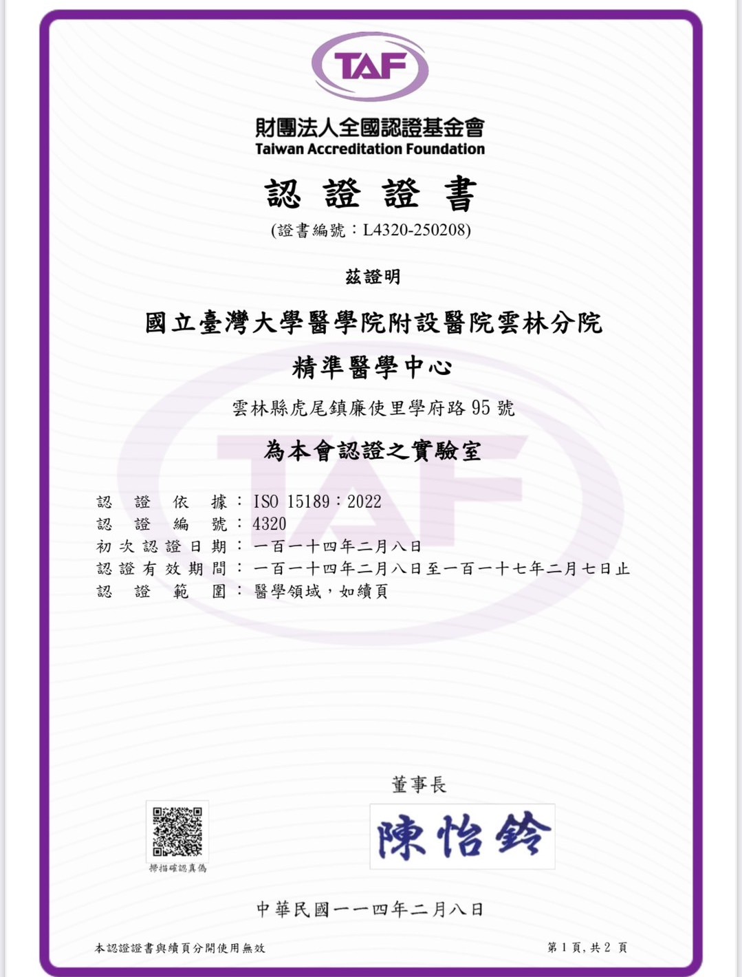 精準醫學中心分別成功取得ISO 15189 中、英文版認證證書,確立其在國際醫學檢測領域的專業地位。(圖/記者蘇榮泉翻攝)