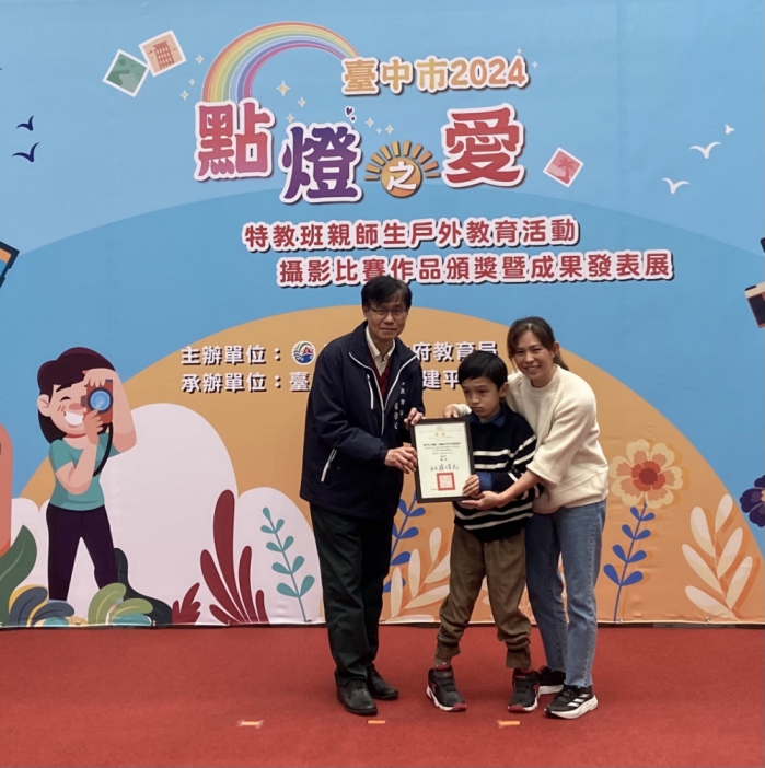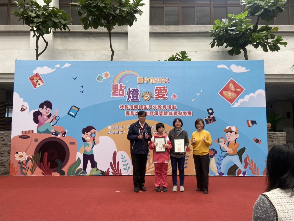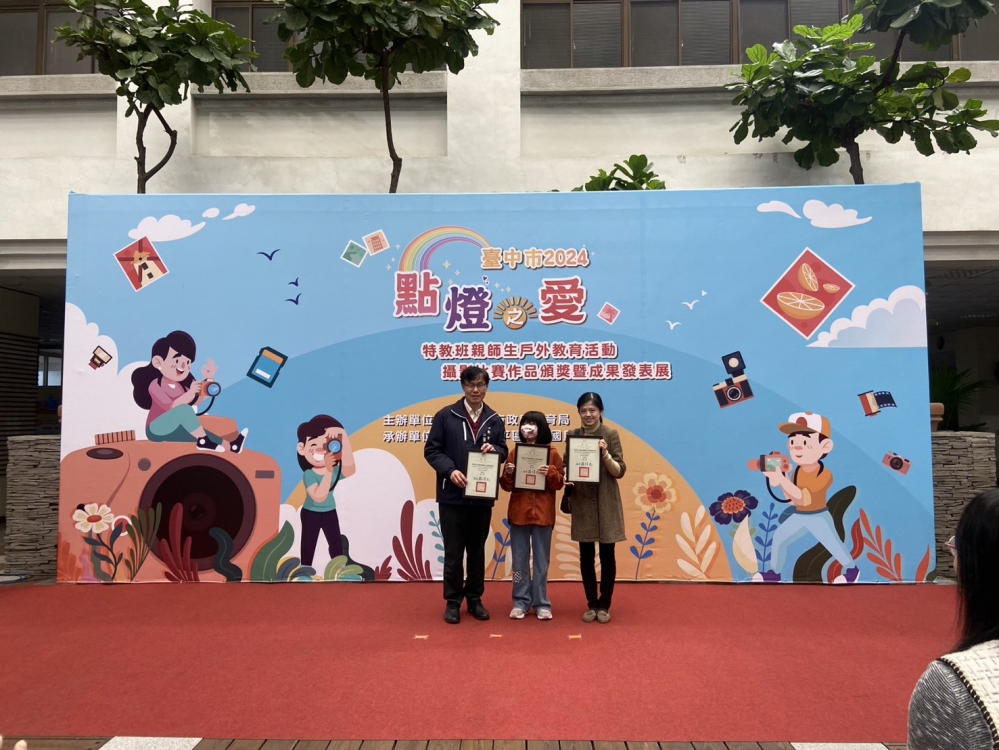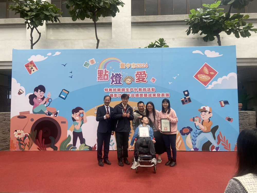 【記者林獻元台中報導】台中市政府教育局7日在陽明市政大樓辦理「台中市113年點燈之愛特教班親師生戶外教育活動攝影比賽頒獎暨成果發表」,教育局長蔣偉民頒獎給獲獎師生,獲獎的孩子們帶著自信的笑容走向舞台接受表揚,陪同參與的教師及家長也一同沉浸在這歡樂的氣氛中;這些得獎作品今天起在陽明市政大樓1樓中庭展出2週,歡迎民眾踴躍參觀。