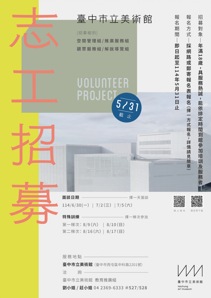 文化局補充,中美館以推動美感教育與文化平權為核心理念,首批將招募導覽解說、觀眾服務、空間管理及推廣服務等四大類別志工,並透過多元培訓課程、研習觀摩等,結合志工本身專業、智慧與經驗,為中美館注入豐沛的服務能量。