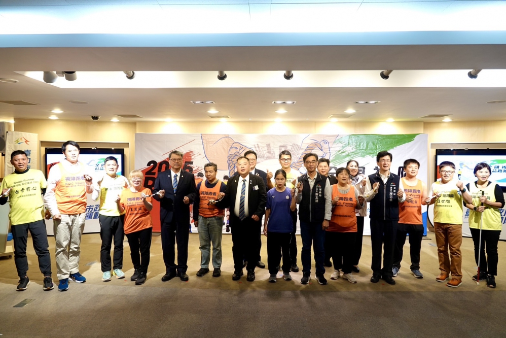 2025「一起奔跑,陪伴共好」全國視障RUN公益路跑賽宣傳記者會,台中市政府運動局長游志祥、社會局副局長廖宗侯、台中馬拉松扶輪社社長何坤記、國際扶輪3461地區總監何信宗、總監當選人蔡陽明、社團法人中華視障路跑運動協會理事長郭俊毅、團長陳文龍、惠明視障者教養院院長甘淑娟、台灣視多障協會理事長張世勳、社團法人台灣視障慈善協會理事長劉素貞、羅布森股份有限公司董事長汪世旭、維他露基金會執行長詹益榮、帕運視障田徑國手吳宜容、視障跑者呂冠霖等人均出席。