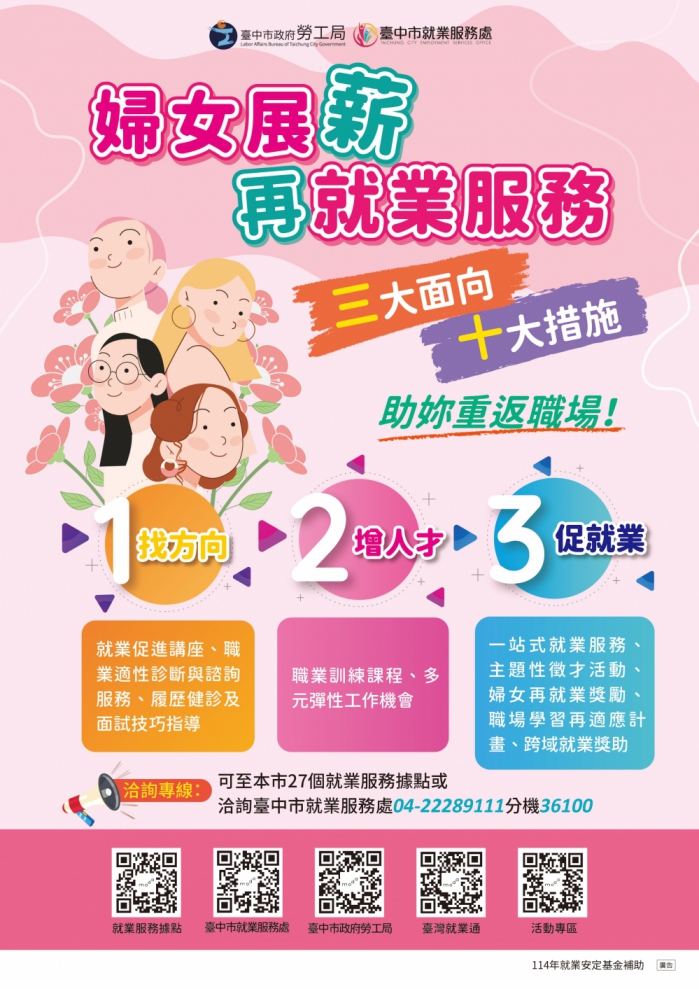 台中市就業服務處補充,若想了解更多婦女就業資訊,歡迎參考「婦女展薪再就業服務專區」( https://gov.tw/MH6 ),另該處亦辦理多場徵才活動,如有需求歡迎至熱門活動專區( https://gov.tw/XJo )或電洽市府總機04-22289111分機36100洽詢。