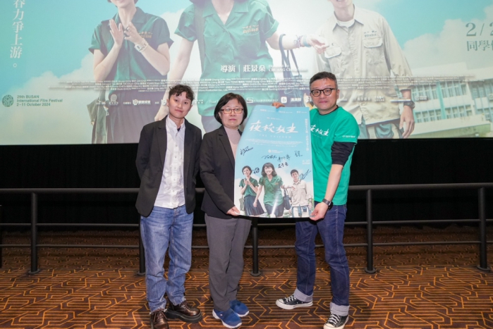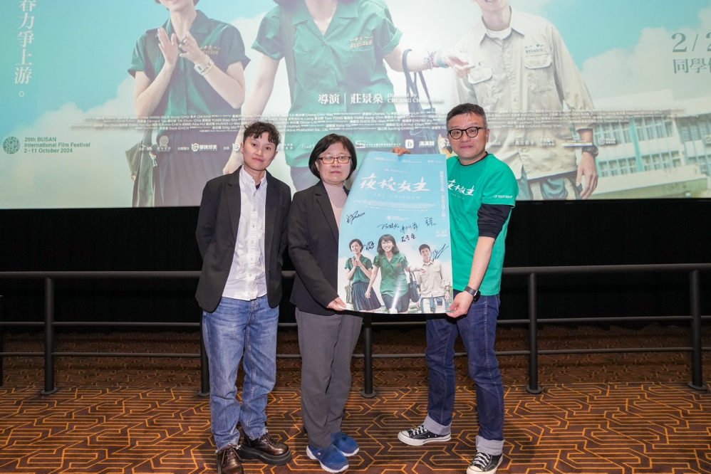【記者張原銘、張皓傑台中報導】電影《夜校女生》描繪90年代校園青春生活帶來的酸甜苦辣,台中特映會9日於老虎城威秀影城舉行,監製唐在揚、導演莊景燊、演員陳姸霏現身與影迷同歡,台中市政府新聞局副局長陳瑜及台中市影視發展基金會副執行長張婉榆出席力挺。陳副局長表示,《夜校女生》是優質國片,主創團隊用心拍攝,找來金獎導演和演員真摯呈現親子相處、青春友誼、初戀苦澀及升學考試等議題,成為兩代之間對話的作品,邀請民眾進戲院支持,祝票房長紅。