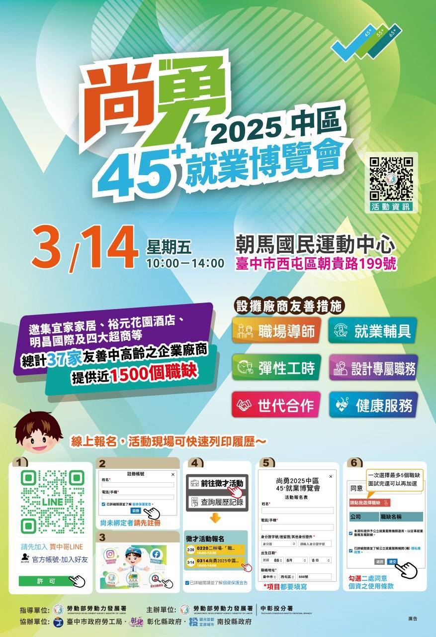 【記者張原銘、張皓傑台中報導】 台灣邁入超高齡社會,企業人力資源布局迎來新挑戰,中高齡及高齡勞動力的有效運用成為關鍵。勞動部勞動力發展署中彰投分署攜手臺中市、彰化縣及南投縣政府,首度舉辦中部規模最大的「尚勇2025中區45⁺就業博覽會」,特別精選37家企業、開發近1500個友善職缺,提供職場導師、就業輔具、設計專屬職務,以及彈性工時等多元化職務再設計措施,讓45⁺求職者能在友善職場環境中安心續航。3月14日,就博會將於臺中市朝馬國民運動中心登場,現場六大專區整合求職、培訓與職涯規劃,助45⁺求職者掌握新機遇,開創精彩第三人生。