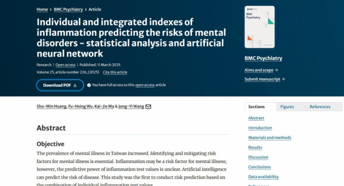 【記者張原銘、張皓傑台中報導】台灣罹患精神疾病的民眾逐年增加,隨著人工智慧漸趨成熟,將AI技術應用於疾病預測也正在發展當中;中國醫藥大學公共衛生學院王中儀教授運用深度神經網路(Deep neural network)技術,以校院合作方式成功開發出以各項炎症指標進行預測罹患各主要種類精神疾病之風險模型,甫刊載於知名國際期刊《BMC Psychiatry》,受到醫學界的關注。