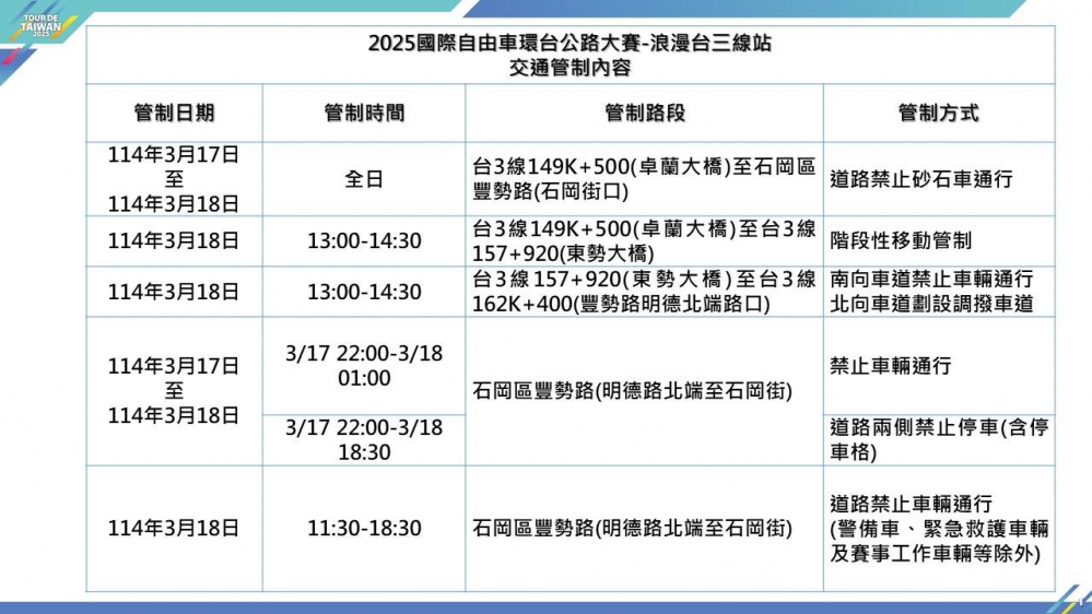 【記者張原銘、張皓傑台中報導】「2025國際自由車環台公路大賽-浪漫台3線站」活動賽事將於3月18日盛大舉行,賽程橫跨新竹縣、苗栗縣、台中市等3縣市,車隊行經範圍自卓蘭大橋進入台中市轄內東勢區,經東蘭路、東勢大橋進入石岡區豐勢路,終點站設在石岡旅客服務中心。市府客委會指出,3月17日至3月18日全線禁止砂石車通行,3月18日下午1時至2時30分卓蘭大橋至東勢大橋路段實施階段性移動管制,東勢大橋至石岡旅客服務中心路段,南向車道禁止車輛通行,北向車道劃設調撥車道,實施單線雙向調撥管制。