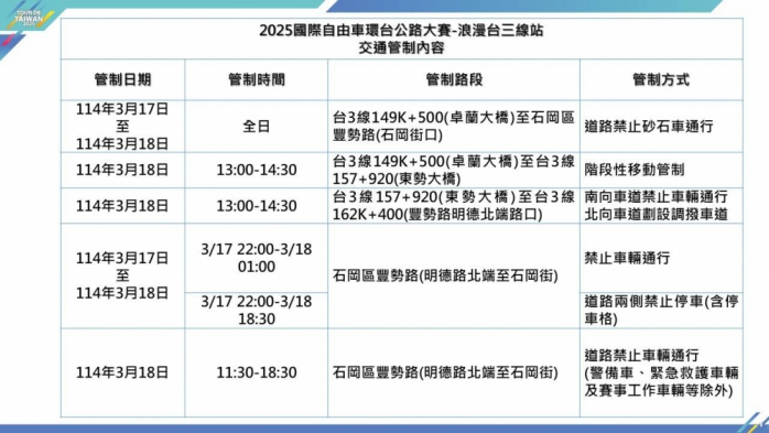 市府客委會指出,考量賽事終點站位於石岡旅客服務中心,石岡區豐勢路自明德路北端路口至石岡街口於3月18日上午11時30分至下午6時30分全線採淨空管制、3月18日8時30分至下午6時30分禁止路邊停車,籲請民眾多加留意。另外,配合舞台及柵欄搭設,3月17日晚上10時至3月18日凌晨1時、上午5時至上午7時禁止路邊停車(包含停車場),豐勢路往石城街改為調撥車道,豐勢路明德路北端路口至石岡街口封閉。