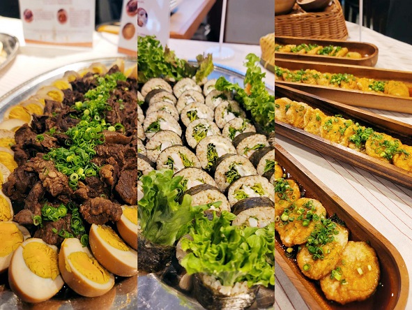 ▲現場來賓對台東特色食材的創新呈現讚譽有加(料理左起為紅烏龍茶燉煮宮崎牛筋、宮崎名物生菜卷佐小米、酥炸小米燉丸)