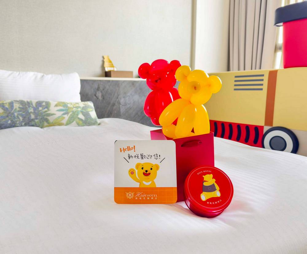 蕭友信董事長指出,新悦花園酒店全館擁有6大房型共24間不同風格的親子主題房,深受親子家庭的喜愛,尤其是房內專屬的溜滑梯設施、可愛造型床舖及多項貼心的親子設備,像是房內主題益智牆及新悦熊家族森林探險任務書,讓親子間的互動能更加融洽,感受到賓至如歸的舒適感。