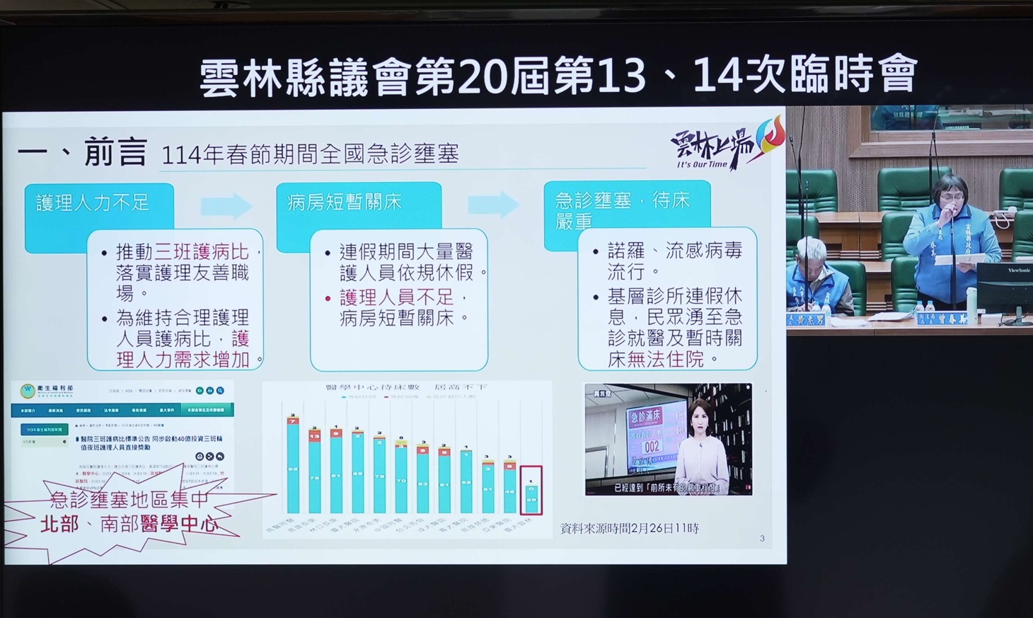 因應全國急診擁塞,護理人力不足,衛生局議會專題報導。(圖/記者蘇峯毅翻攝)