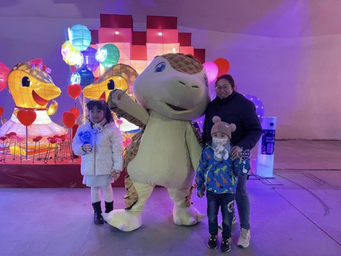 中台灣燈會「樂in LOVE」燈區票選人氣票選,南屯可愛吉祥物「咖咖」現身「南屯情緣_讓幸福蔓延」燈區與大小朋友同樂。 -