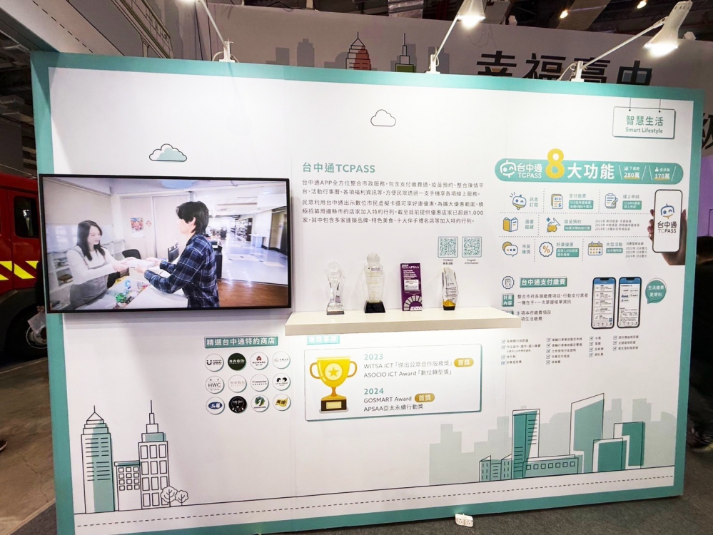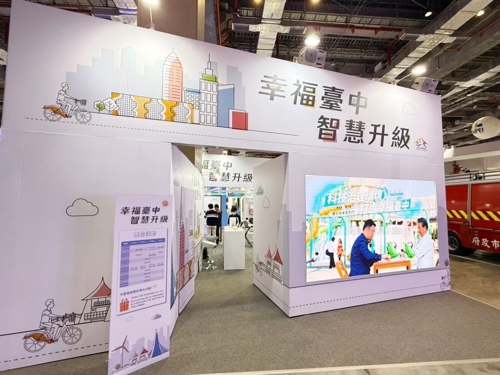 本次台中市展區規劃「智慧生活」、「智慧交通」、「智慧環境」與「智慧治理」四大主題,呈現多項智慧應用解決方案,包括台中通全方位整合市政服務,讓民眾一機在手即享有各項線上服務與特約好康優惠;導入AI、物聯網及大數據等技術,應用在空氣品質管理監測、道路巡檢、水域安全防護等領域,全面提升城市治理效率。