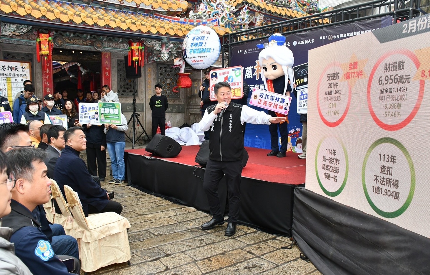 活動現場,雲林縣警察局局長李建民帶領20多名警察同仁,發表「打詐儀錶板」報告,分析雲林縣近期詐騙案件的現況與打詐成效。根據統計,2024年2月雲林縣詐騙受理案件數為201件,相較1月減少91件,下降31.16%;財損數額為6,956萬元,較1月減少9,398萬元,下降57.46%。