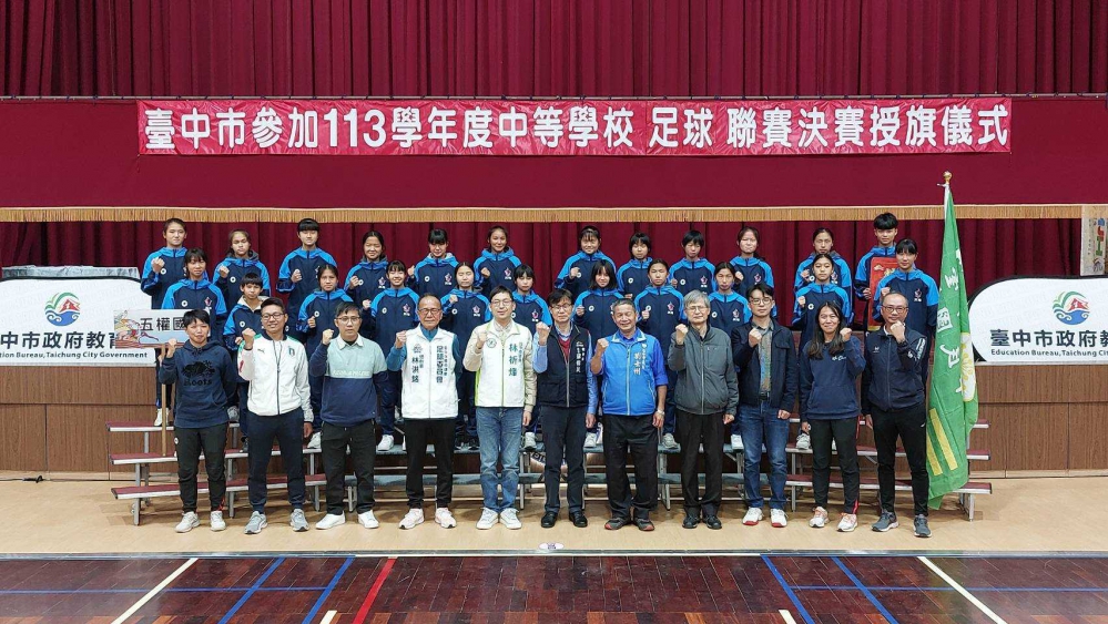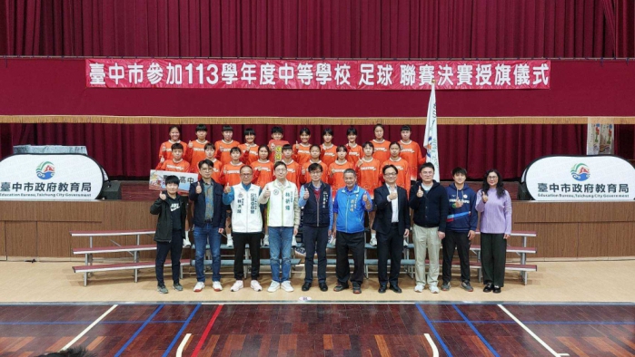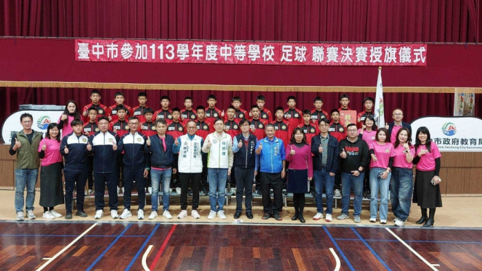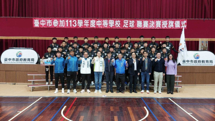 【記者林獻元台中報導】113學年度中等學校足球聯賽(HFL)將於3月25至30日陸續開踢,台中市政府教育局長蔣偉民19日在黎明國中為參加決賽的4隊選手們授旗,並代表市長盧秀燕致贈加菜金,為教練及選手們加油打氣,期許小將們在賽場上,踢出自己的夢想,凱旋歸來。