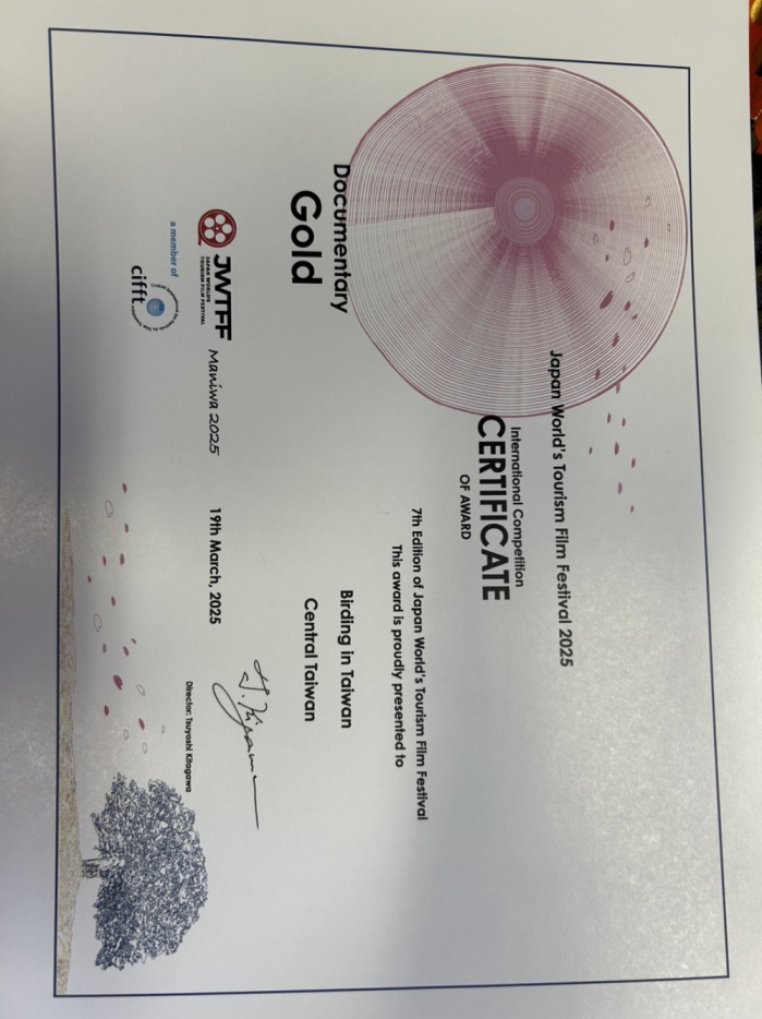 觀光署參山處表示,第七屆日本國際觀光電影節(JWTFF),是為推廣並呈現各地獨特魅力的觀光電影節;今年影展主題為「森林與人類:邁向可持續未來的傳承」,強調社區與自然環境之間的關係,此次得獎影片「Birding in Taiwan」,在紀錄片單元中榮獲金獎,影片展現了生態旅遊的重要性,向全世界介紹台灣中部豐富的鳥類物種與森林資源!