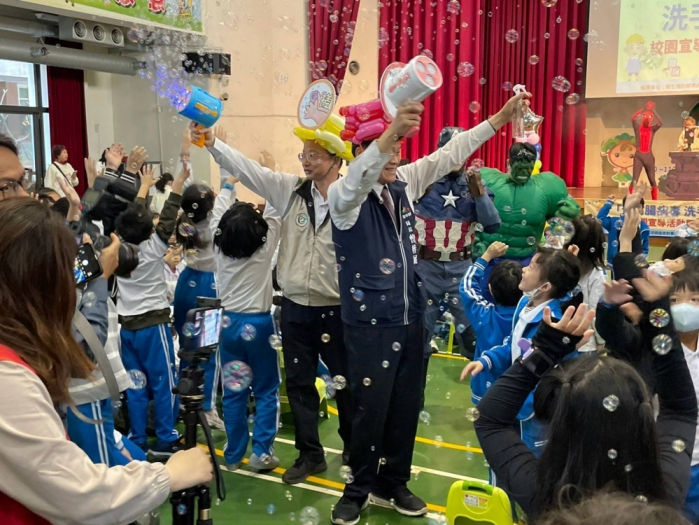 【記者張原銘、張皓傑台中報導】台中市政府衛生局20日於北屯區松竹國小舉辦洗手宣導活動,由衛生局長曾梓展擔任洗手大使,與超級英雄們透過一系列有趣的互動遊戲,教導孩子們正確的洗手五步驟及環境清消方法,一起預防腸病毒。衛生局長曾梓展表示,盼透過輕鬆有趣的方式,讓孩子們在遊戲中學會正確洗手的步驟和時機,並加深預防腸病毒的相關知識。