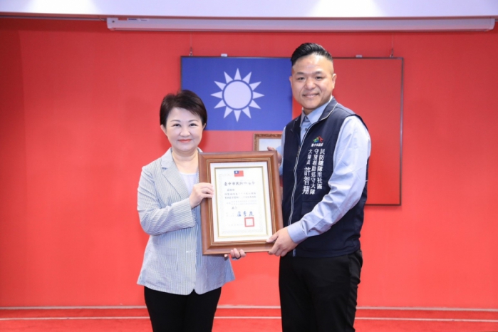 【記者林獻元台中報導】原台中市民防總隊里社區守望相助巡守大隊長賴添華於今年1月達律定年齡上限,不再延任大隊長一職,其遺缺由國雄集團董事長許智翔接任,市長盧秀燕25日在市政會議前頒發新任大隊長派令,並盼許大隊長接任職務後,帶領全市一萬一千名守望相助隊員,奠定台中市社區治安基石,讓市民生活更美好,打造台中成為更幸福宜居的城市。