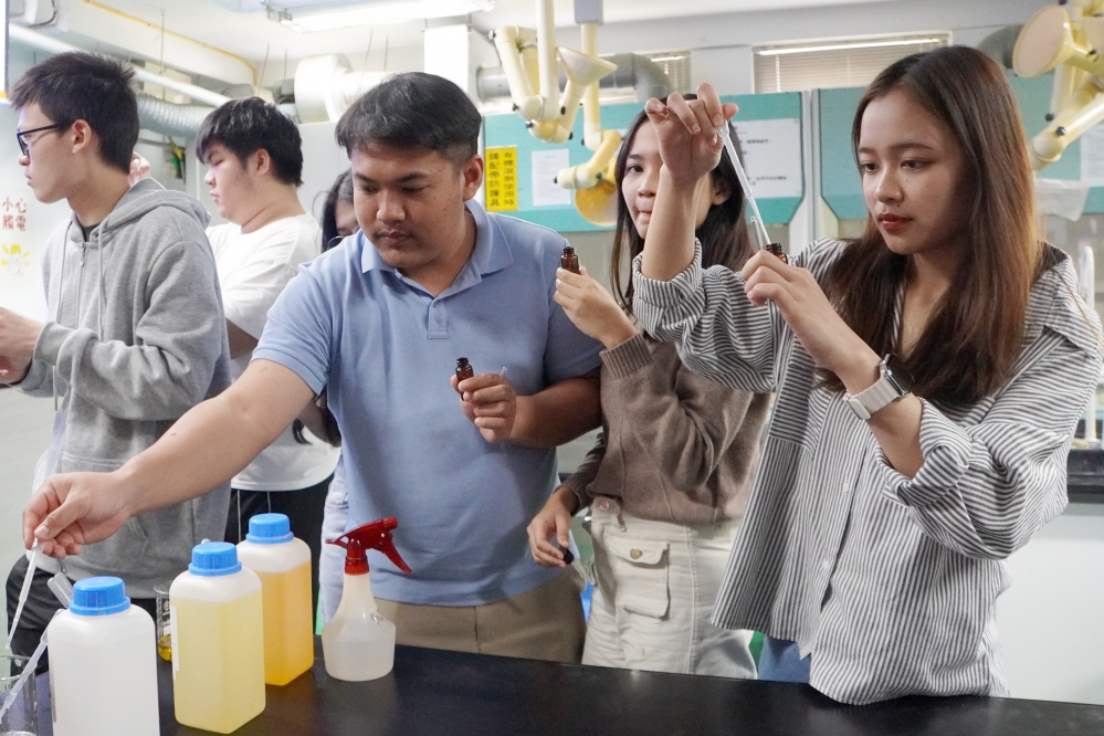 工作坊除有藥保系的「中藥化妝品學」課程學生外,也開放各系學生報名參加,讓台灣學生和外國籍學生一起量測材料,運用基底油和精油,調和屬於自己的香氛,從中認識生物多樣性和永續概念。