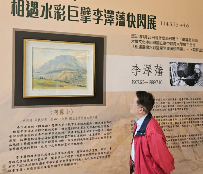 【記者張原銘、張皓傑台中報導】您知道3月25日是什麼節日嗎? 隨著春天的到來,百花齊放讓臺灣的藝術氛圍愈加濃厚,孕育出「臺灣美術節」,為慶祝美術節,大墩文化中心與國立臺中教育大學攜手合作「相遇臺灣水彩巨擘李澤藩快閃展」-〈阿蘇山〉,即日起於大墩文化中心大廳快閃展出至4月6日,邀市民共同走進臺灣第一代水彩畫家-李澤藩的水彩世界。