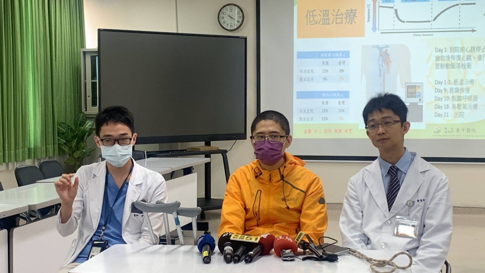 心臟內科醫師黃聖瑋到院後立即進行導管溶栓手術,並商調低溫療法儀器送到院,以34度低溫療法降低腦細胞等損傷,徹夜搶救;隔日胸腔內科醫師黃仲儒接手重症加護病房照護,患者成功在住院第九天清醒,第十天脫離呼吸器,第二十一天康復出院;目前等病況穩定後,再進行原本腳傷韌帶治療。