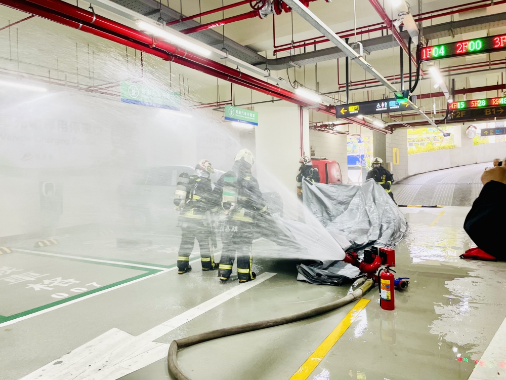 【記者王雲彬、馬淑娟潭子報導】因應電動車輛日益增加,台中市政府交通局為提供更安全的停車環境,31日協同消防局、民間業者在潭子區潭興立體停車場舉行電動車消防安全演練,試辦「熱顯像儀」及「低壓細水霧消防設備」防災科技系統,以期電動車起火能將災害降到最低。交通局長葉昭甫表示,全市47座公有立體停車場已配置可抵抗高達1,000°C的滅火毯,未來規劃至少配備兩條,並逐步調整充電車格位置與間距,建構隱形防火牆,確保有適當的逃生動線及救援效能。
