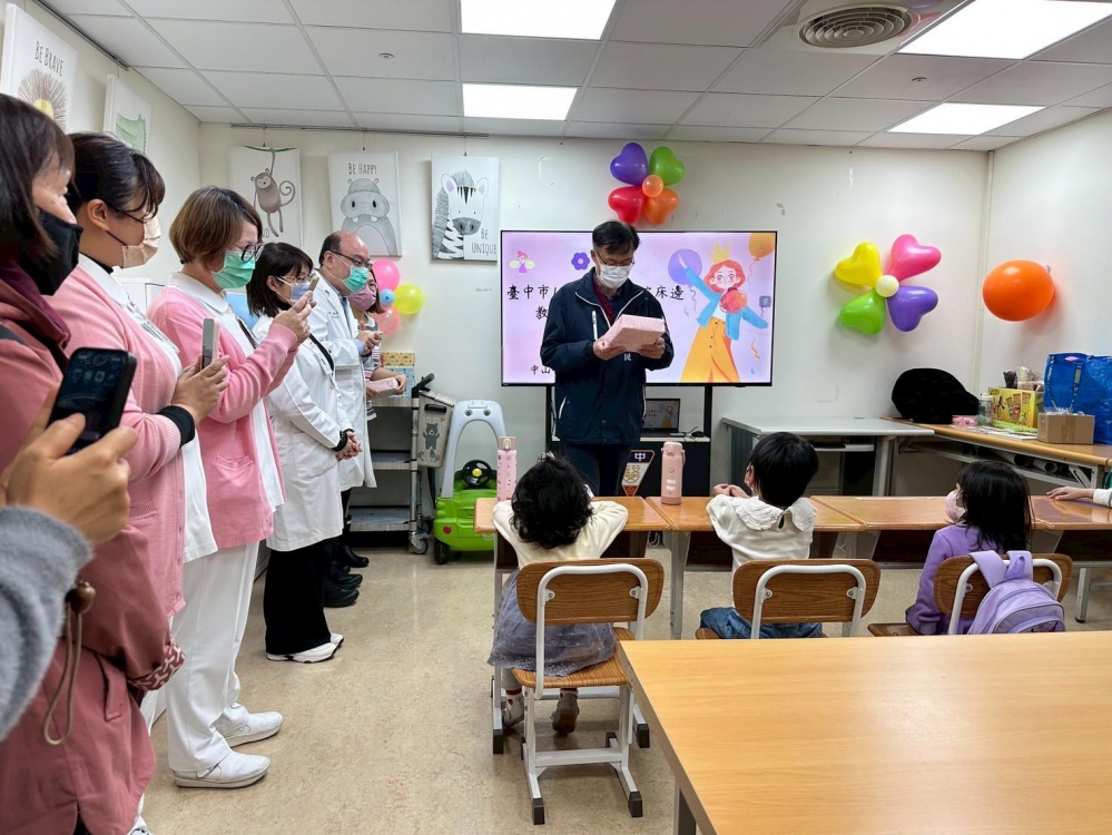 【記者張原銘、張皓傑台中報導】台中市有4所學校設有醫院床邊教學班,為住院的學生提供特殊教育課程及多方面服務,教育局長蔣偉民31日帶領床邊教學班的教師們到中山醫學大學附設醫院,為床邊教學班的學生送上兒童節禮物,並舉行充滿樂趣與創意的慶祝活動,氣氛溫馨快樂,讓孩子們度過一個難忘的兒童節。